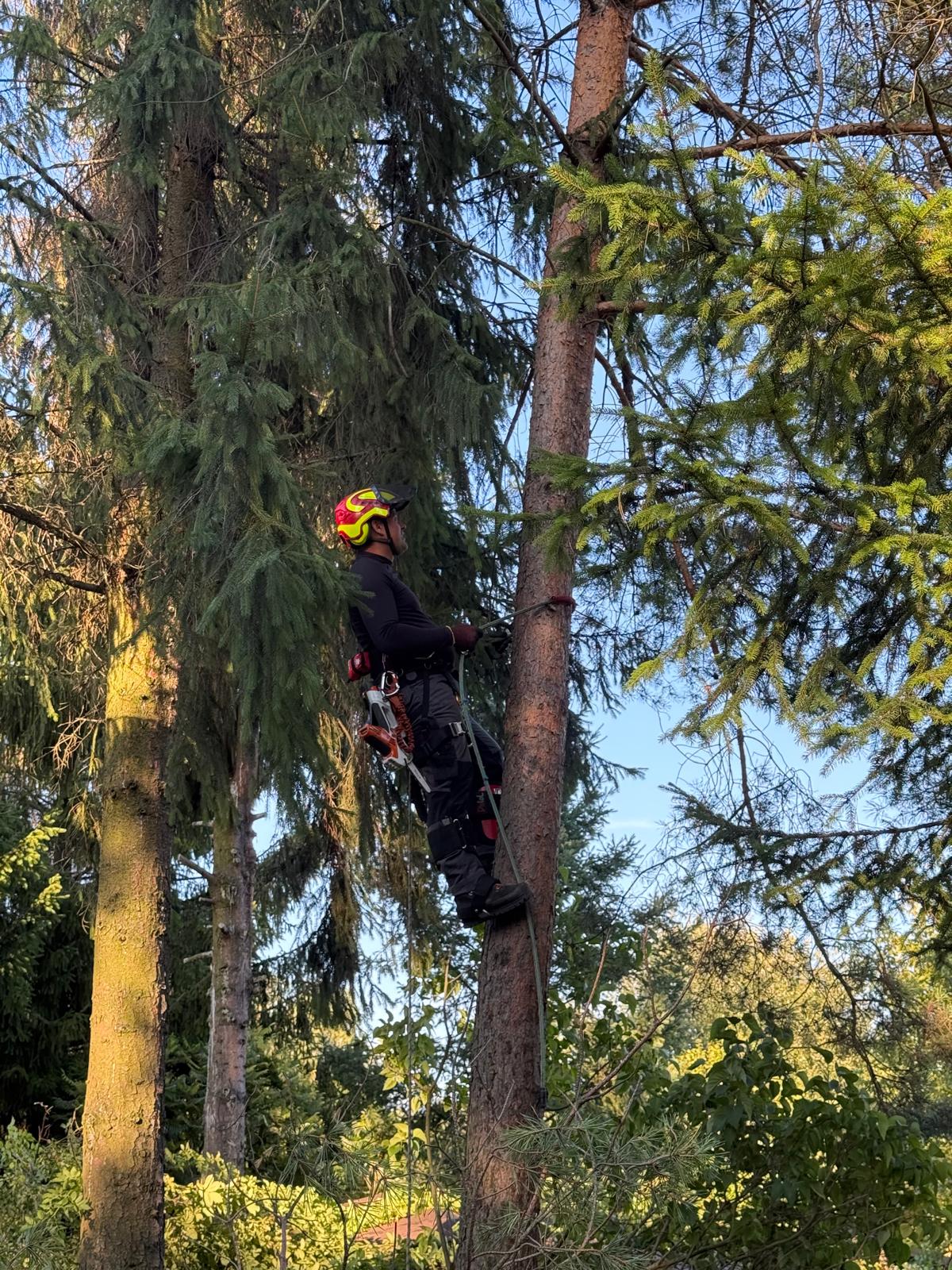 Przycinanie drzew – arborysta na linach tnie gałęzie świerku pilarką