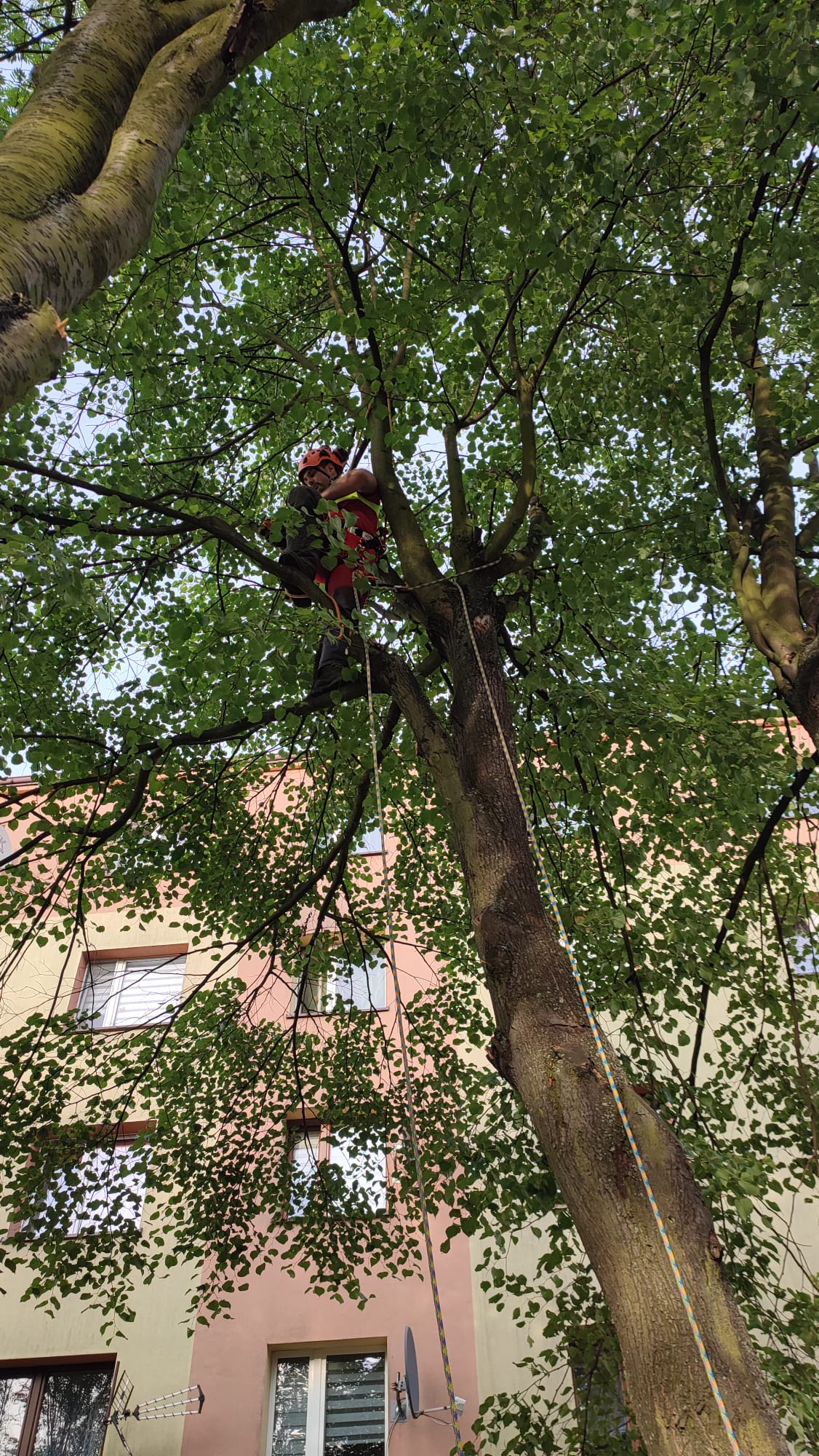Przycinanie drzew – arborysta na linach tnie gałęzie świerku pilarką